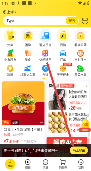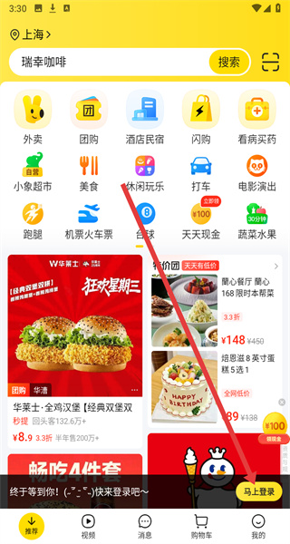 1、在進(jìn)入到美團(tuán)首頁中時(shí),可以點(diǎn)擊下方馬上登錄按鈕,進(jìn)行登錄操作。