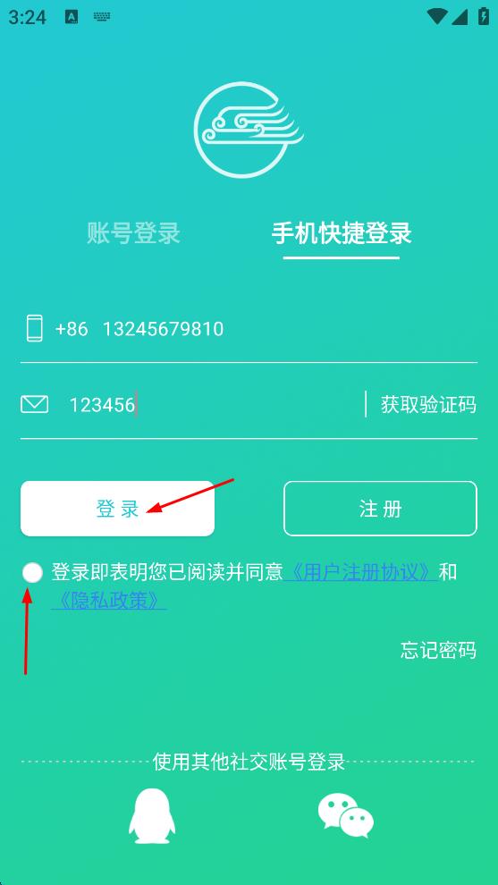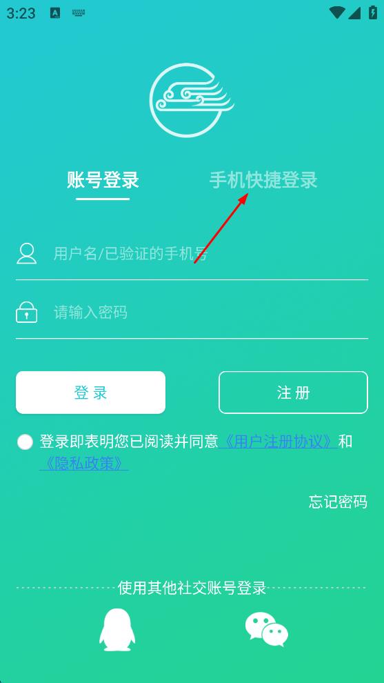 2、在登錄選擇頁面,點擊“手機快捷登錄”,進入手機快捷登錄信息填寫頁面。