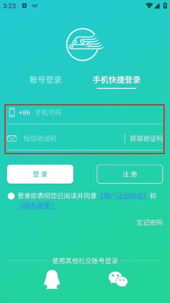 3、在手機快捷登錄信息填寫頁面,先在“手機號碼”欄填寫自己的手機號,然后點擊“獲取驗證碼”,將收到的驗證碼輸入到“短信驗證碼”欄。
