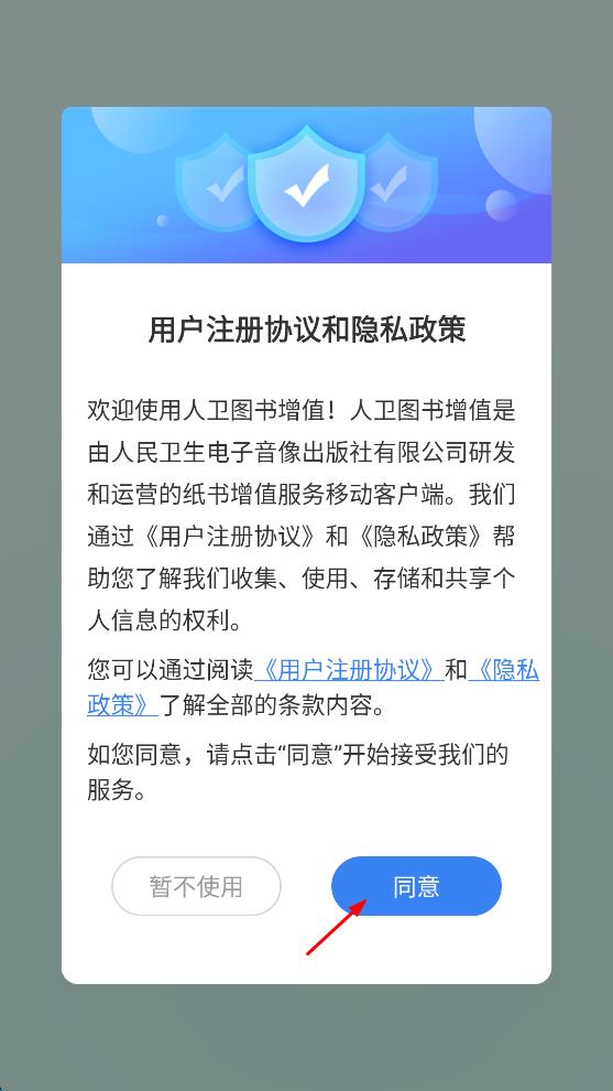 1、打開人衛(wèi)圖書增值軟件,彈出“用戶注冊協(xié)議和隱私政策”提示彈窗,閱讀相關(guān)內(nèi)容后,點擊“同意”,進入登錄選擇頁面。