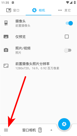1、打開窗口相機(jī)應(yīng)用,點(diǎn)擊左下角的三橫線菜單按鈕。
