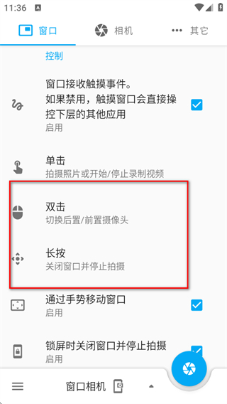 4、在控制設(shè)置中,可設(shè)置雙擊切換后置/前置攝像頭、長(zhǎng)按關(guān)閉窗口并停止拍攝等功能,完成參數(shù)設(shè)置。
