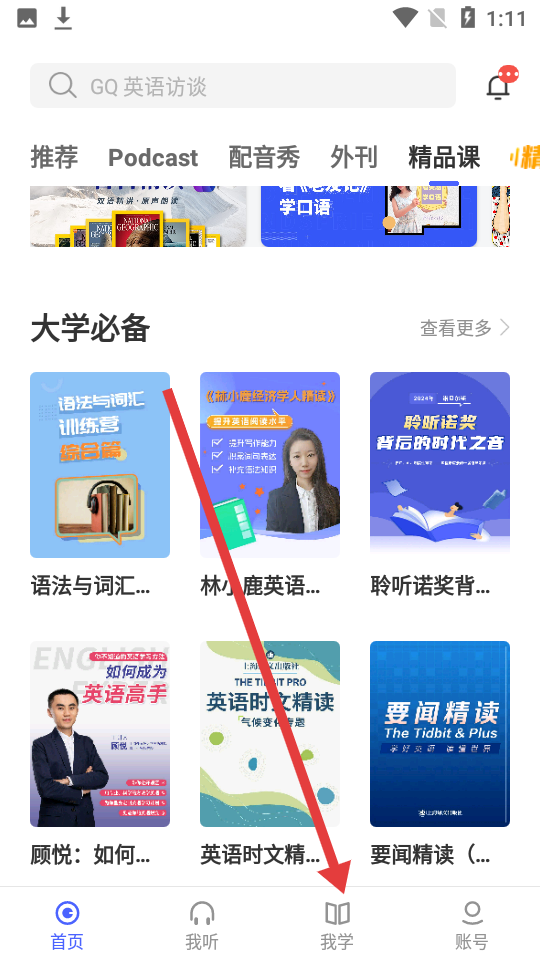 1、打開每日英語聽力APP,點擊底部導(dǎo)航欄中的我學項目。