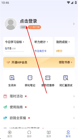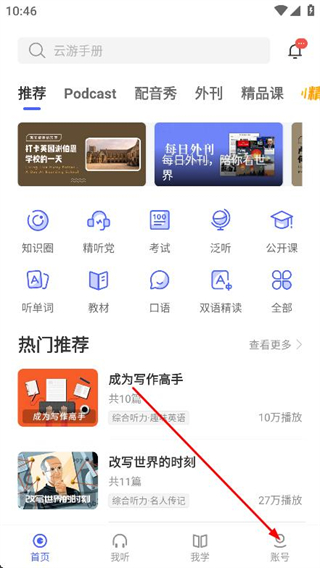 1、打開每日英語聽力,點擊底部導(dǎo)航欄中的賬號選項。