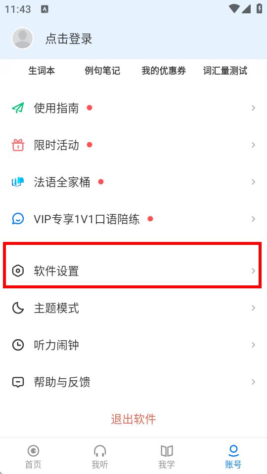 2、在賬號(hào)頁(yè)面里找到并點(diǎn)擊軟件設(shè)置,進(jìn)入設(shè)置界面。