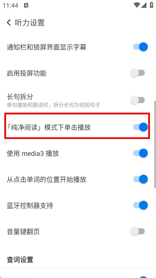 4、在聽(tīng)力設(shè)置界面里,按需開(kāi)啟相關(guān)功能,純凈閱讀模式下單擊播放,開(kāi)啟后能更好滿(mǎn)足精聽(tīng)需求。