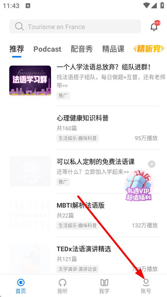 1、打開(kāi)每日法語(yǔ)聽(tīng)力APP,點(diǎn)擊底部導(dǎo)航欄中的賬號(hào)選項(xiàng)。
