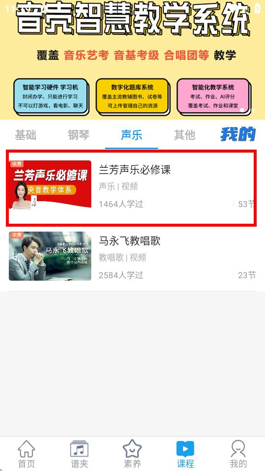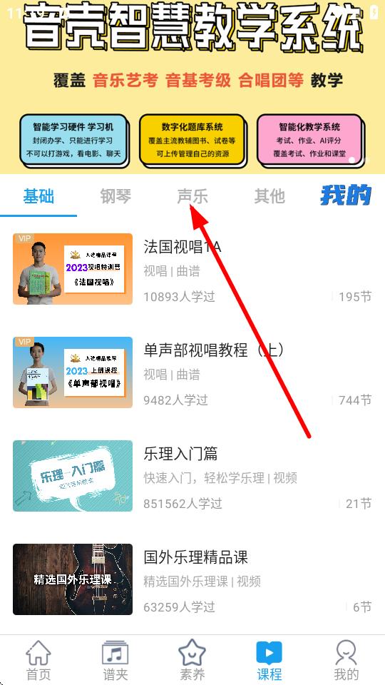 2、在課程頁(yè)面上方的分類標(biāo)簽中,點(diǎn)擊聲樂(lè)標(biāo)簽切換到聲樂(lè)課程分類。
