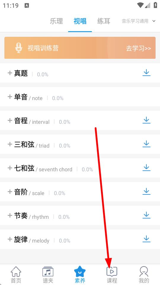 1、打開(kāi)音殼樂(lè)理視唱練app,點(diǎn)擊底部導(dǎo)航欄課程選項(xiàng)進(jìn)入課程頁(yè)面。