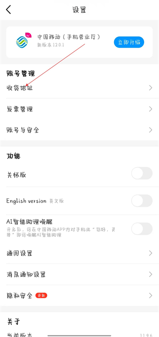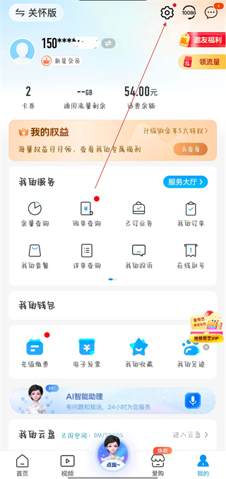 1、打開中國移動APP,點擊右上角的齒輪圖標進入設置界面。