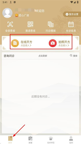 1、提供在線開方和拍照開方兩種方式,方便醫(yī)生為患者開具藥方,可管理全部患者、邀請(qǐng)患者、使用問(wèn)診模版及查看坐診信息。
