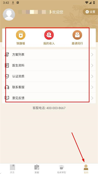 4、可查看錦旗墻、我的收入、邀請(qǐng)同行等信息,管理方案列表、醫(yī)生資料、認(rèn)證資質(zhì),還能聯(lián)系客服、提交意見反饋。