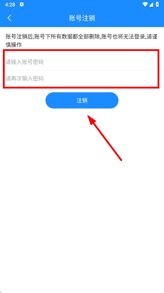 4、在賬號注銷頁面,按要求輸入賬號密碼,并再次輸入密碼進行確認,確認無誤后點擊注銷按鈕,完成賬號注銷操作。