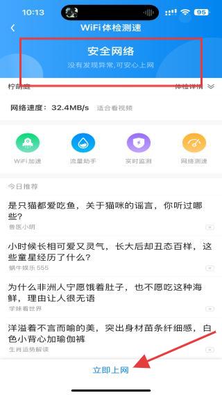 4、測(cè)速后顯示安全網(wǎng)絡(luò),再點(diǎn)擊正下方的立即上網(wǎng)的功能按鈕。