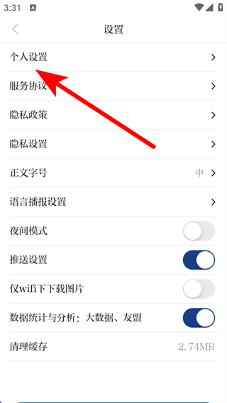 3、在設(shè)置的頁面,需要點擊個人設(shè)置的按鈕,進(jìn)入個人資料頁面。