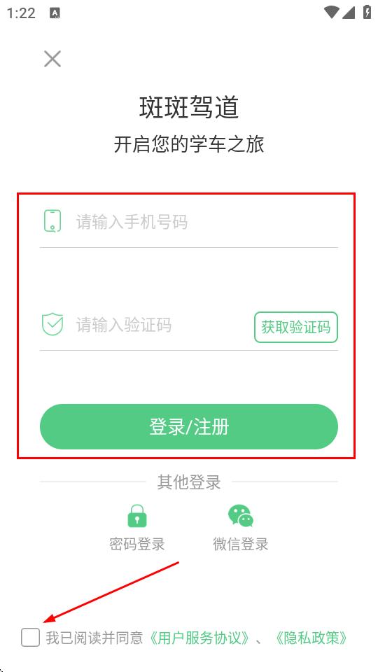 4、在登錄界面,勾選我已閱讀并同意用戶服務(wù)協(xié)議、隱私政策,輸入手機號碼,填入驗證碼,點擊登錄/注冊按鈕完成登錄。
