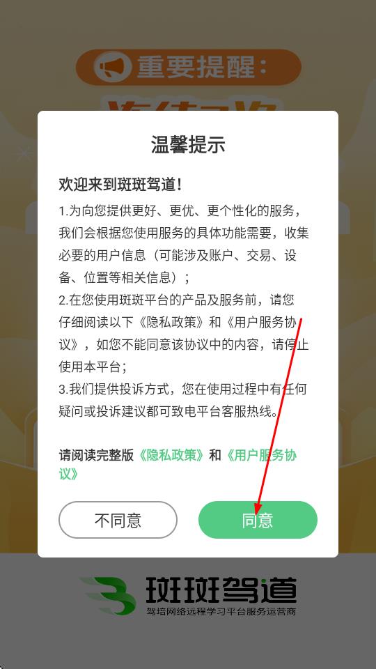 1、打開斑斑駕道APP,在彈出的溫馨提示窗口中,點擊同意按鈕,進(jìn)入APP主界面。