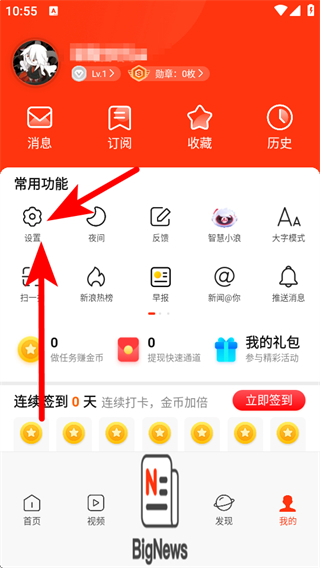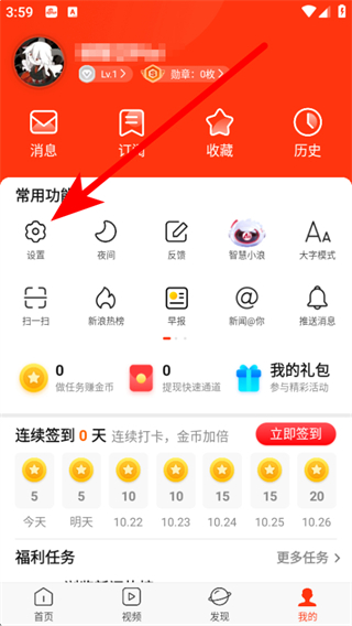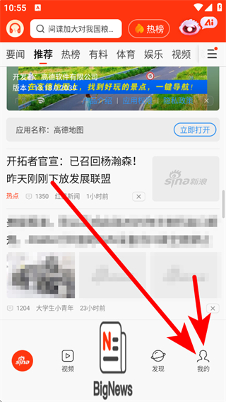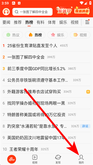 1、打開新浪新聞app,在首頁點擊底部我的,進入個人頁面。