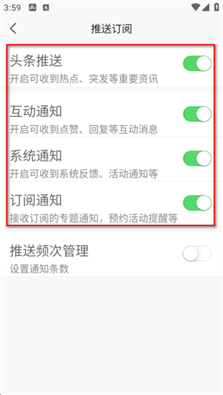 4、在推送訂閱設(shè)置頁面,將頭條推送等開關(guān)關(guān)閉,即可關(guān)閉對應(yīng)推送。