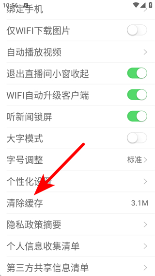 3、在設(shè)置頁面中,點擊清除緩存選項,即可完成緩存數(shù)據(jù)的清除操作。