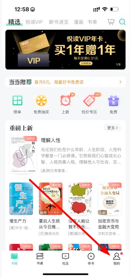 1、打開(kāi)當(dāng)當(dāng)云閱讀app,點(diǎn)擊底部導(dǎo)航欄中的我的選項(xiàng)。