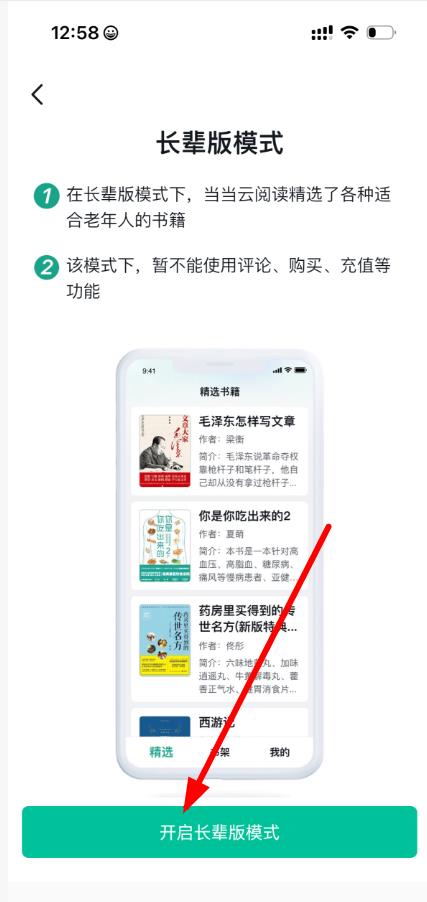3、進(jìn)入長(zhǎng)輩版模式介紹頁(yè)面后,點(diǎn)擊下方“開(kāi)啟長(zhǎng)輩版模式”按鈕,即可成功開(kāi)啟長(zhǎng)輩版模式。