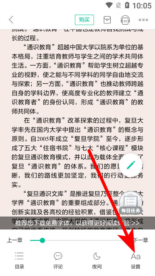 3、在閱讀界面,點(diǎn)擊右下角設(shè)置選項(xiàng),進(jìn)入設(shè)置頁(yè)面。