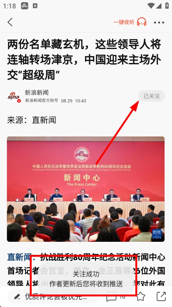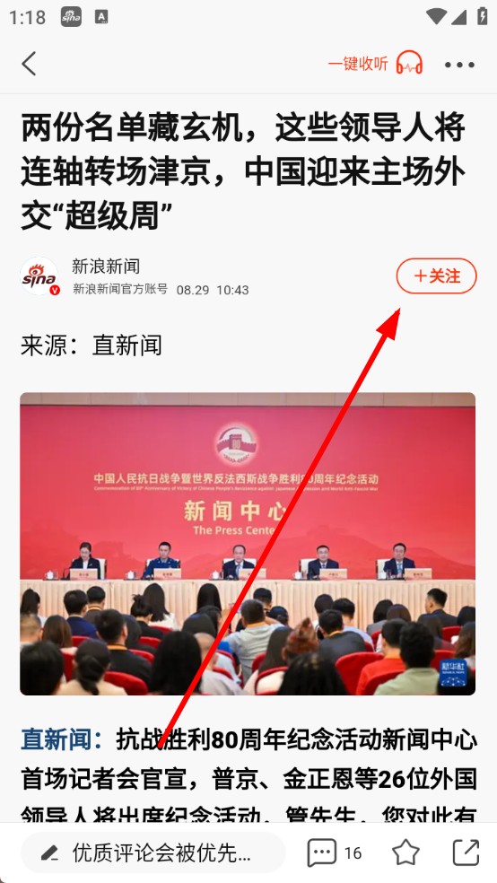 2、進(jìn)入新聞詳情頁后,在新聞標(biāo)題下方,找到發(fā)布該新聞的賬號(hào)名稱旁的+關(guān)注按鈕,點(diǎn)擊它。