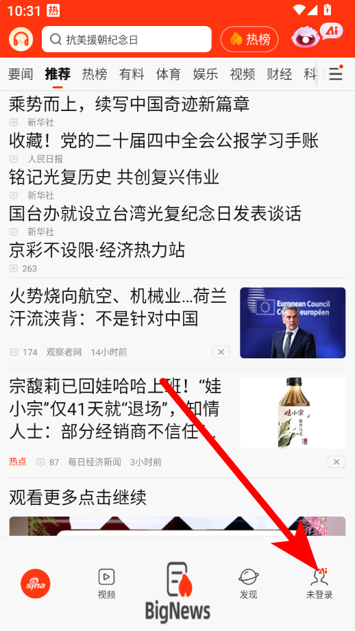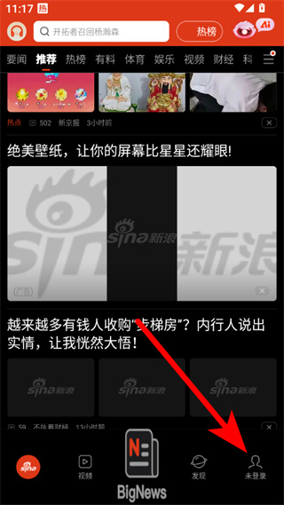 1、在新浪新聞主頁面,點(diǎn)擊右下角未登錄圖標(biāo),進(jìn)入個(gè)人界面。