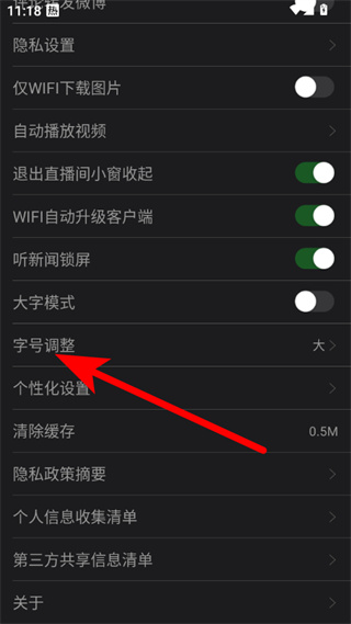 3、在設(shè)置界面,點(diǎn)擊字號(hào)調(diào)整選項(xiàng),進(jìn)入字號(hào)調(diào)整頁面。