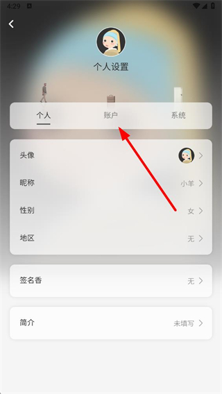 3、在個(gè)人設(shè)置頁(yè)面,點(diǎn)擊賬戶(hù)選項(xiàng),切換到賬戶(hù)設(shè)置界面。