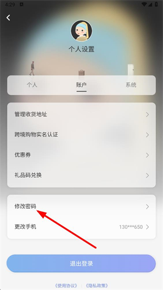 4、在賬戶(hù)設(shè)置界面里,點(diǎn)擊修改密碼選項(xiàng)。
