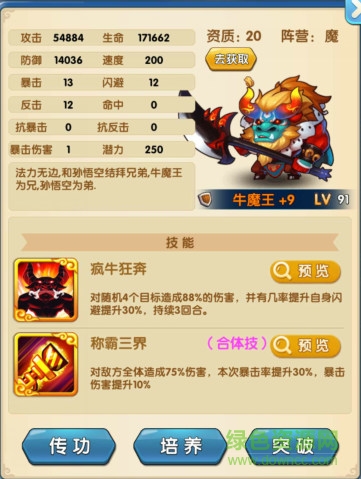 突破:可以讓伙伴的基礎(chǔ)屬性和成長屬性大大提升,且品質(zhì)也會有所提升,獲得更多的被動技能。