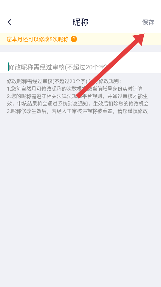 3、在昵稱修改頁(yè)面輸入新昵稱需遵守規(guī)則,不超過20字,點(diǎn)擊右上角保存按鈕,完成昵稱修改。