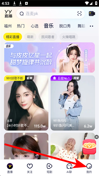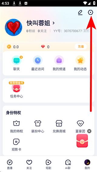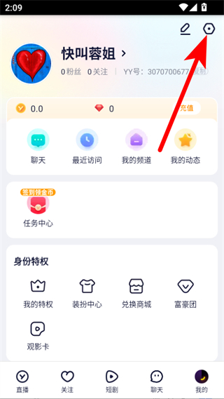 1、打開YY App,點(diǎn)擊底部導(dǎo)航欄的我的選項(xiàng),進(jìn)入個(gè)人頁(yè)面。