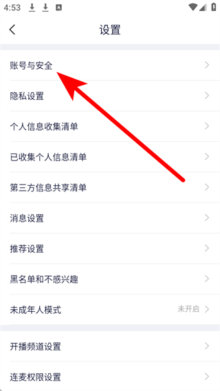 3、在設(shè)置頁(yè)面中,點(diǎn)擊賬號(hào)與安全選項(xiàng)。