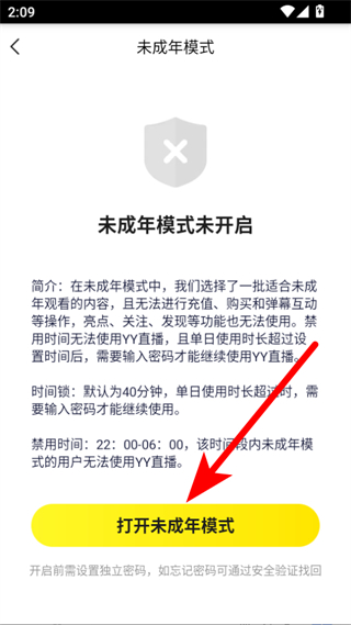 4、在未成年人模式設(shè)置頁(yè)面,點(diǎn)擊打開未成年模式按鈕,按照提示設(shè)置獨(dú)立密碼后即可開啟青少年模式。