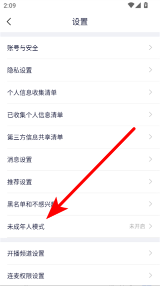 3、在設(shè)置界面中,點(diǎn)擊未成年人模式選項(xiàng),進(jìn)入未成年人模式設(shè)置頁(yè)面。