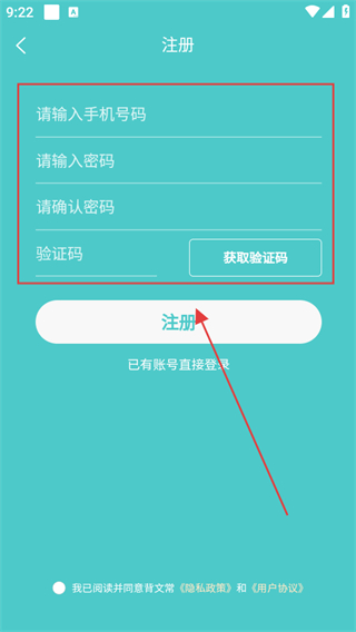 4、輸入手機號碼、密碼、確認密碼、驗證碼,勾選隱私政策和用戶協(xié)議,點擊注冊。
