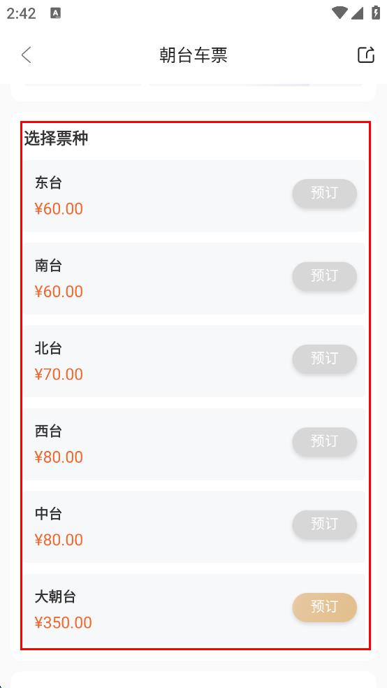 4、在朝臺車票預訂頁面,選擇要預訂的票種,比如“大朝臺”,點擊其旁的“預訂”按鈕,按照提示完成朝臺車票的預訂操作。