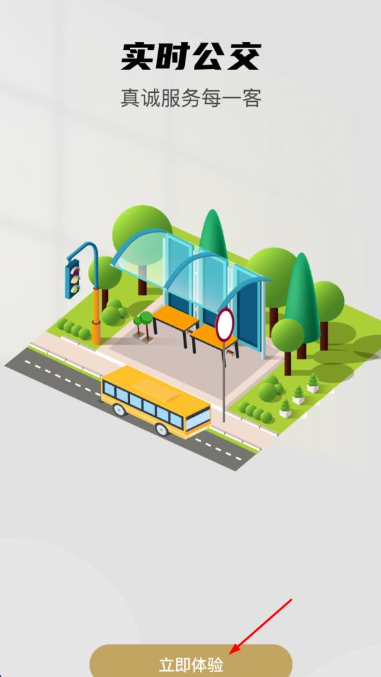 1、打開實時公交軟件,看到“實時公交真誠服務每一客”的宣傳界面,點擊“立即體驗”按鈕,進入軟件主界面。