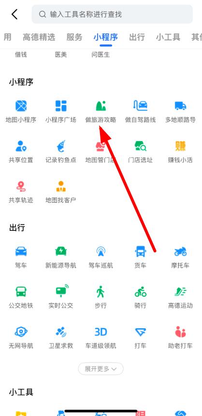 1、打開高德地圖,點(diǎn)擊我的,找到更多工具并點(diǎn)擊,在小程序板塊里選擇做旅游攻略。