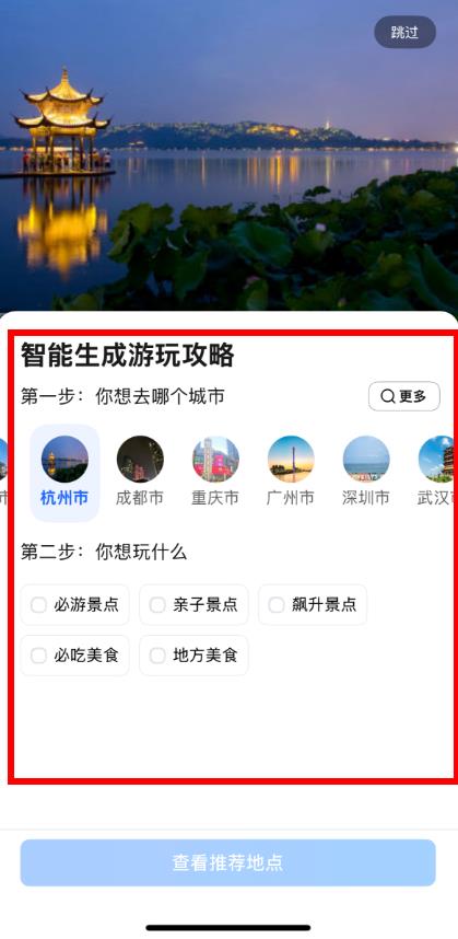 2、進(jìn)入智能生成游玩攻略界面,第一步選擇想去的城市,第二步選擇想游玩的類型,比如必游景點(diǎn)、必吃美食等。