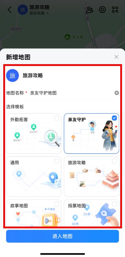 3、點(diǎn)擊相關(guān)選項(xiàng)新增地圖,自定義地圖名稱,選擇模板如親友守護(hù)、旅游攻略等,進(jìn)入地圖后進(jìn)一步完善旅游攻略內(nèi)容。