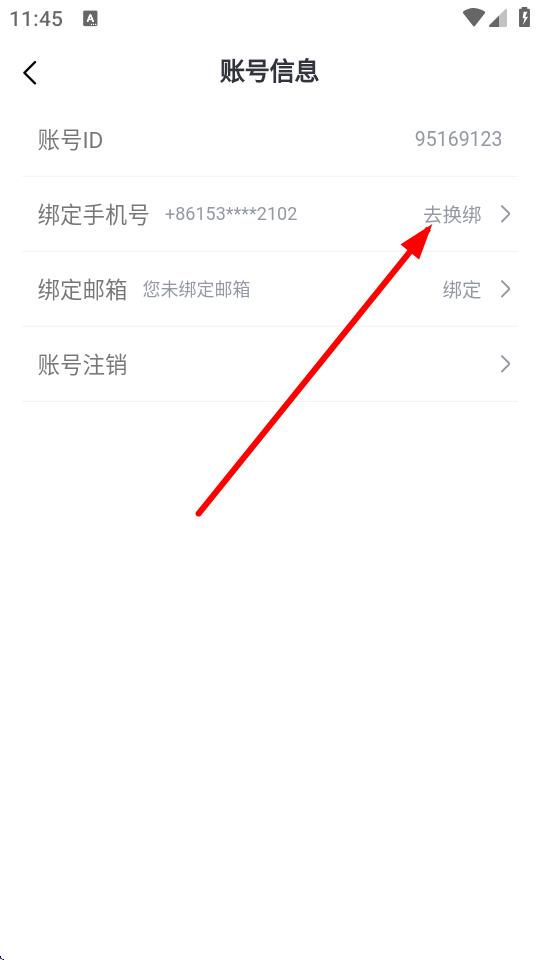 4、在賬號(hào)信息頁(yè)面中,找到綁定手機(jī)號(hào)一欄,點(diǎn)擊右側(cè)的去換綁,按照提示完成換綁操作。