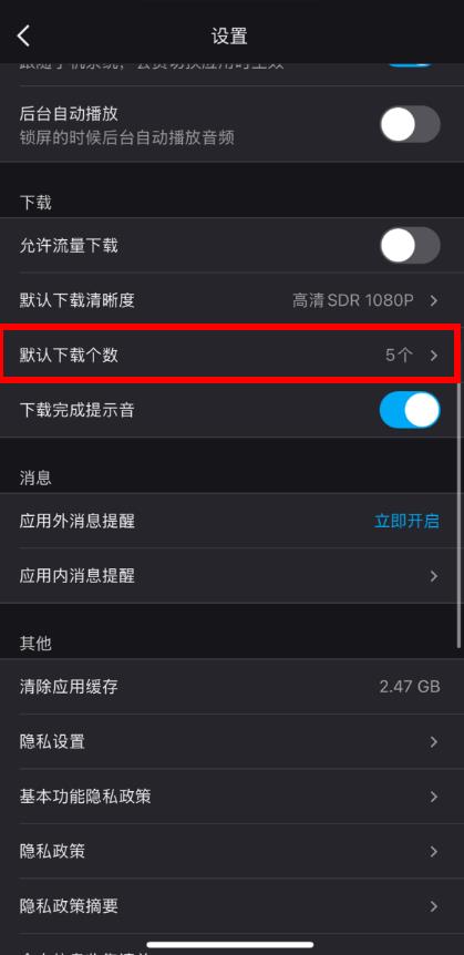 2、在設置頁面中,找到并點擊默認下載個數(shù)選項。