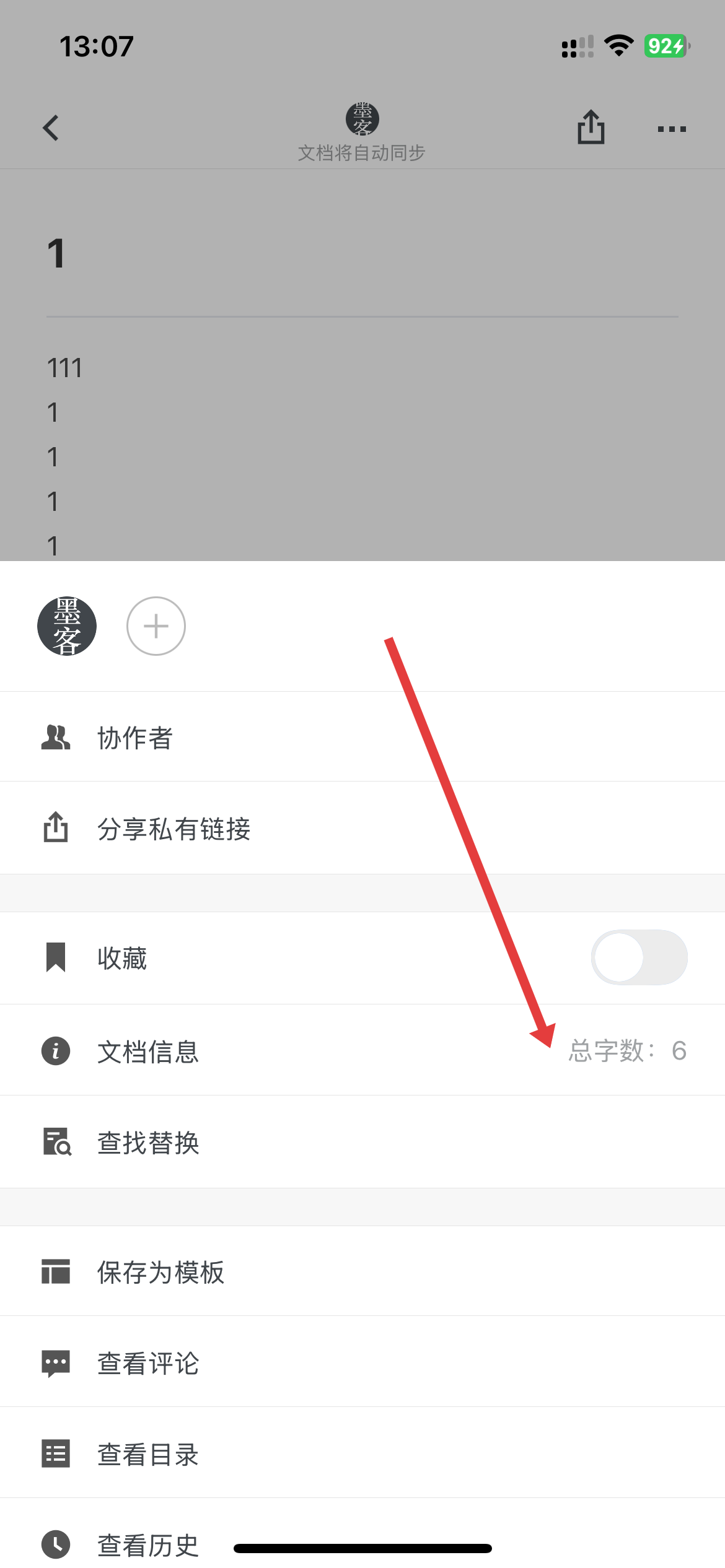 4、在彈出的菜單中,找到文檔信息選項(xiàng),在其右側(cè)查看文檔總字?jǐn)?shù)。