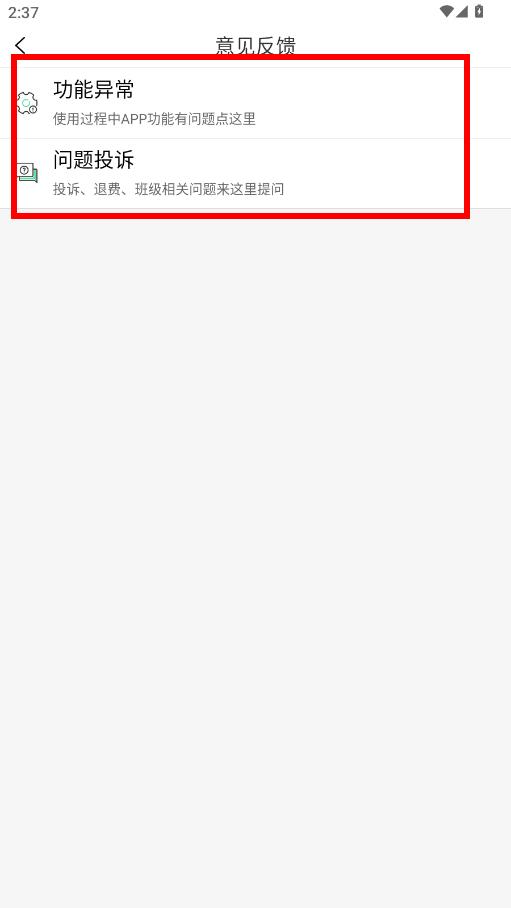 3、在意見反饋頁面,可根據(jù)需求選擇功能異?;騿栴}投訴等類別。