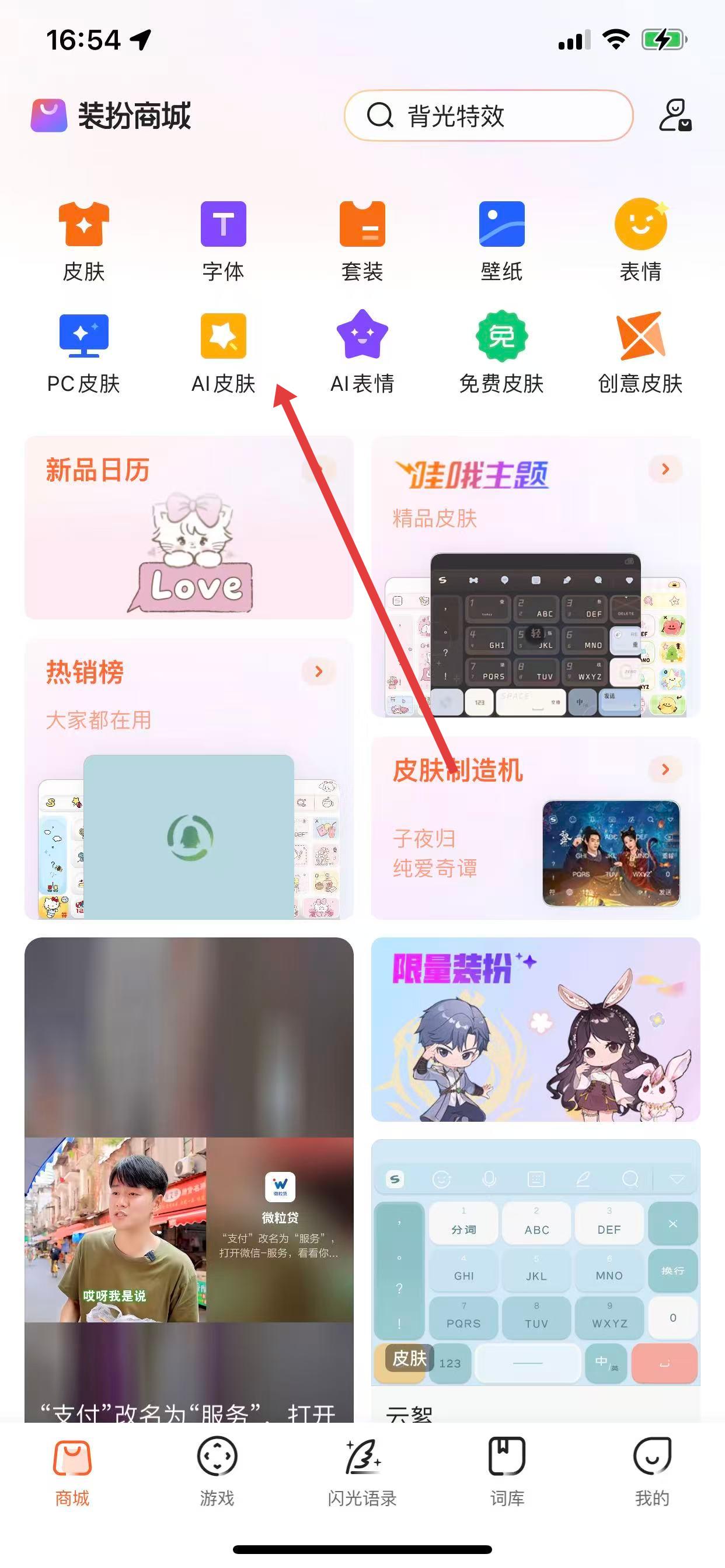 1、打開(kāi)搜狗輸入法,進(jìn)入裝扮商城界面,AI皮膚選項(xiàng)。