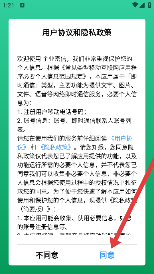 1、進入app后閱讀用戶協(xié)議和隱私政策內(nèi)容后,點擊頁面底部同意按鈕,確認(rèn)協(xié)議并繼續(xù)使用。